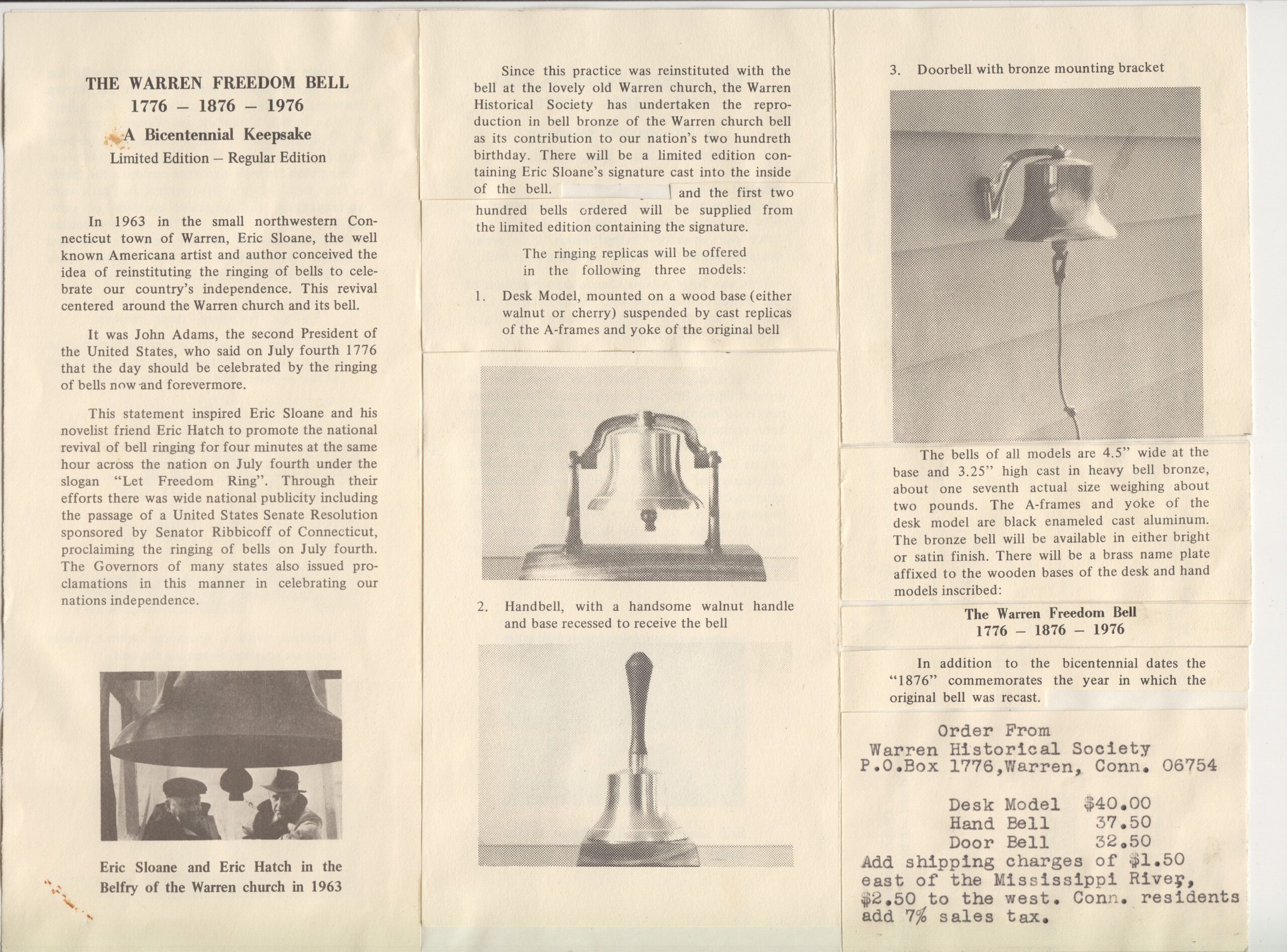The idea for the Warren Freedom Bell was inspired by Eric Sloane, who with his friend and fellow author Eric Hatch, created “The Committee of the Two Erics”, which created a national campaign to institute bell ringing on Independence Day. It was with the Warren church bell that Sloane and Hatch inaugurated the practice.